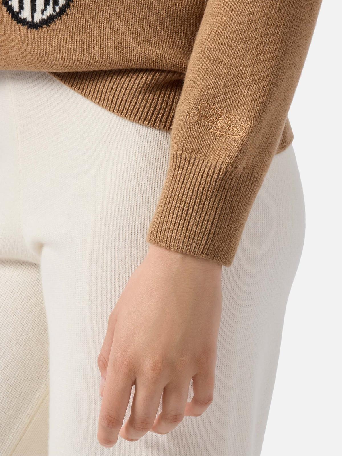 New Queen cammello incontra Snoopy: jacquard e ricamo a contrasto per un tocco iconico e playful.