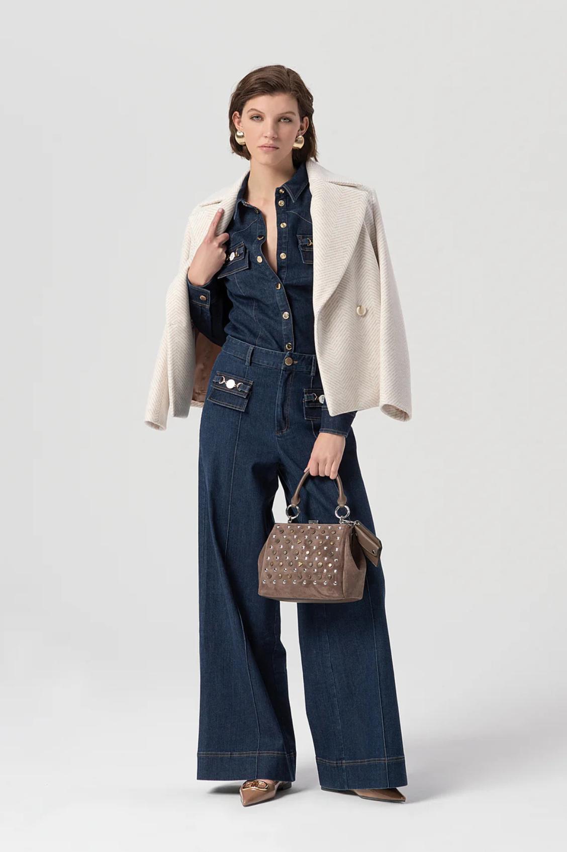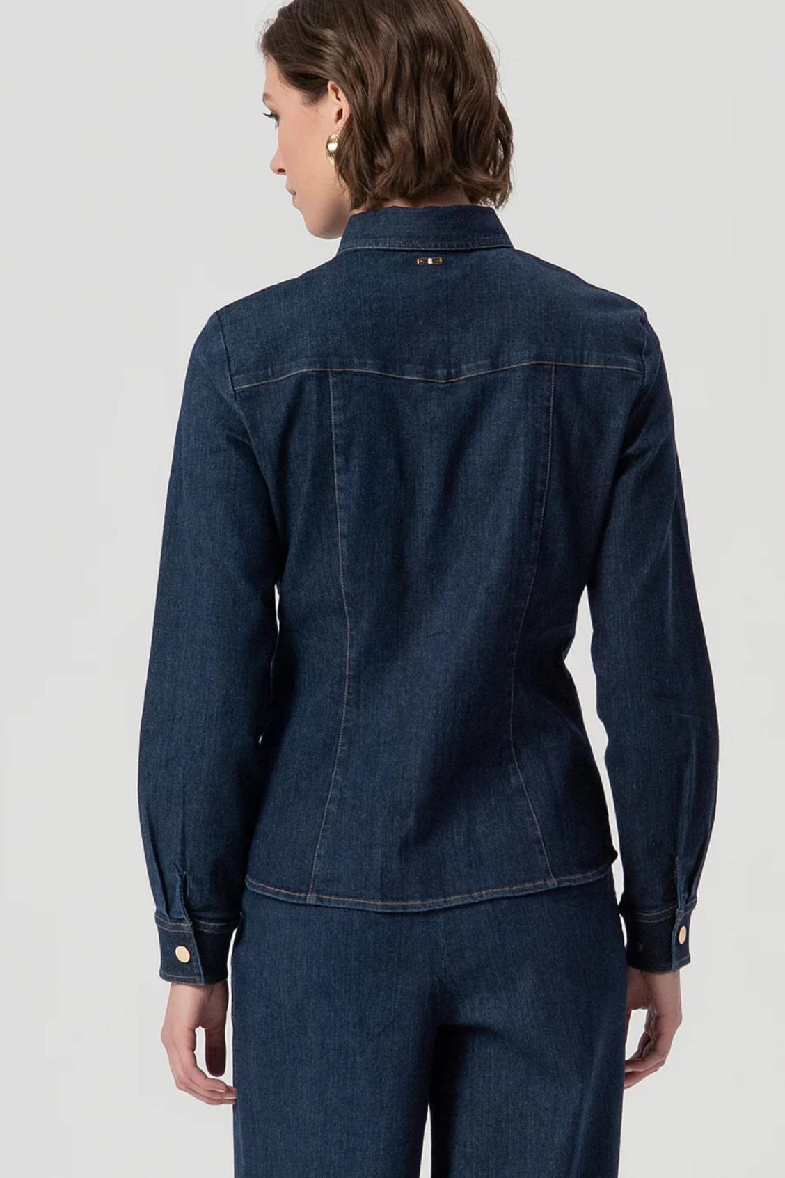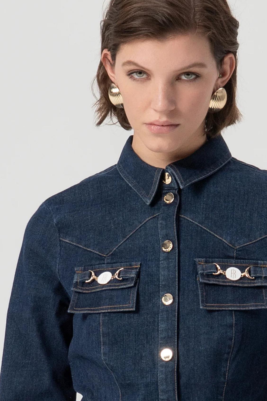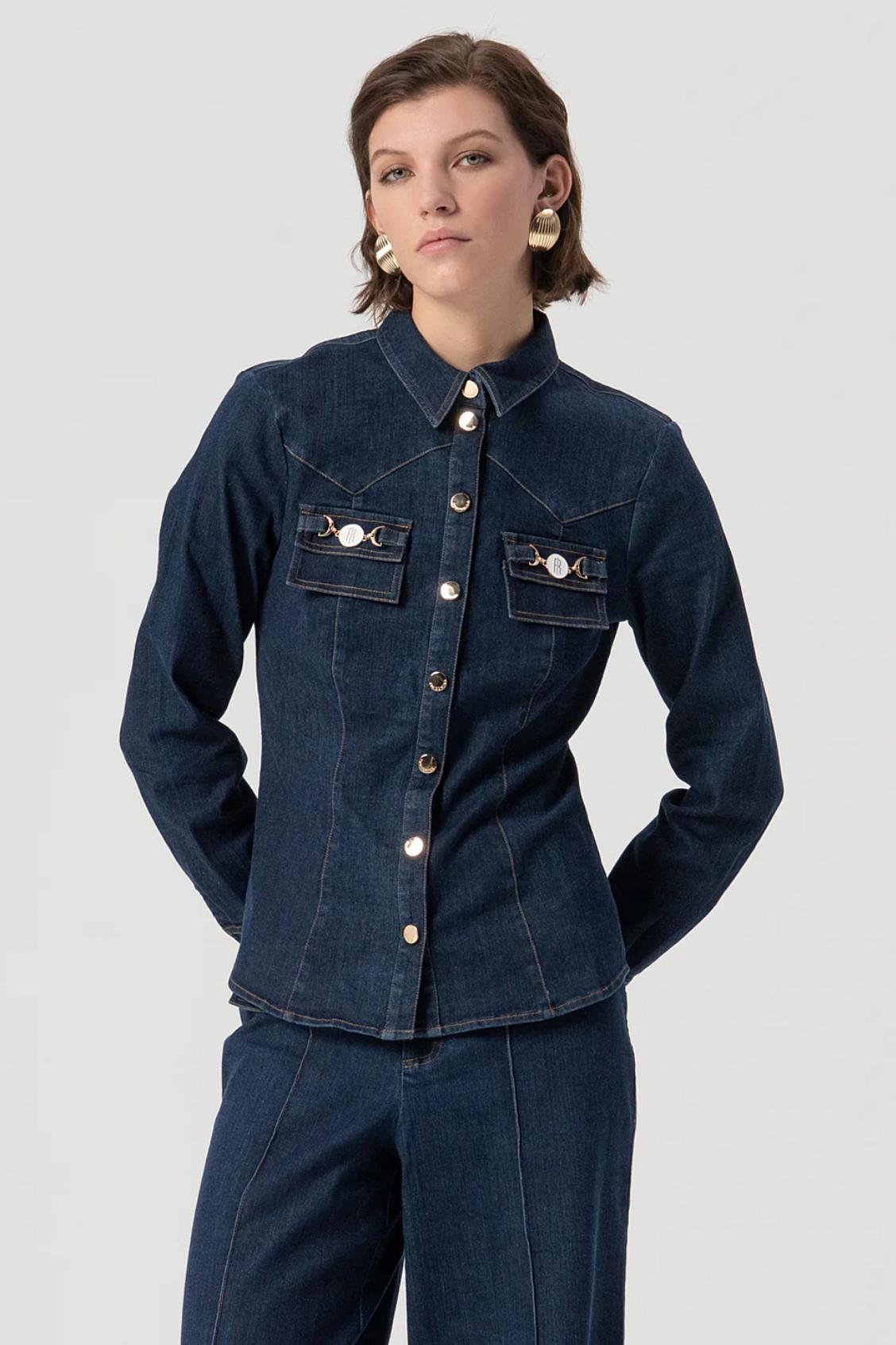 Camicia slim in denim con lavaggio medio, colletto classico, tasche sul petto con accessorio metallico, bottoni centrali per apertura, e con maniche lunghe.