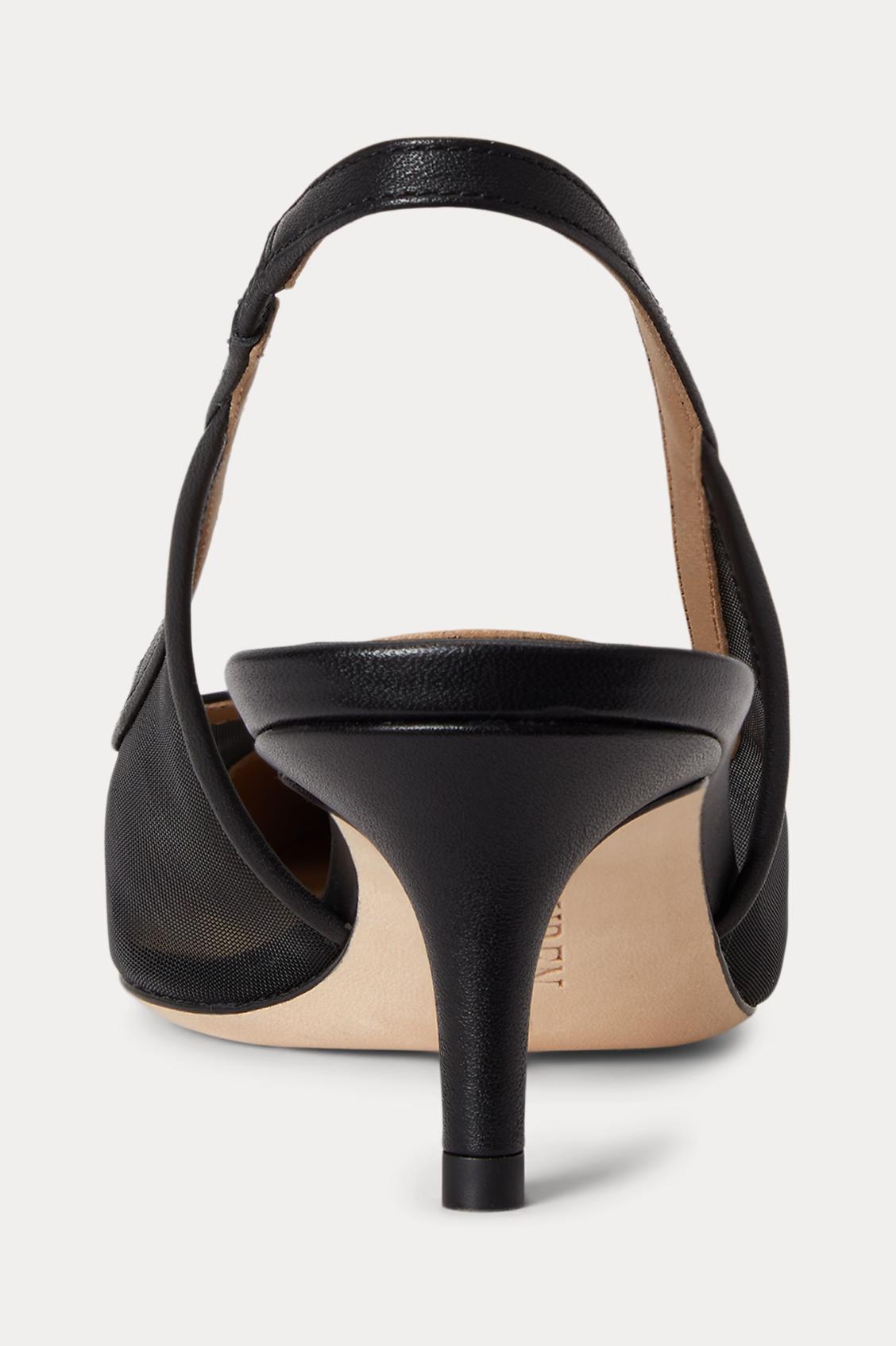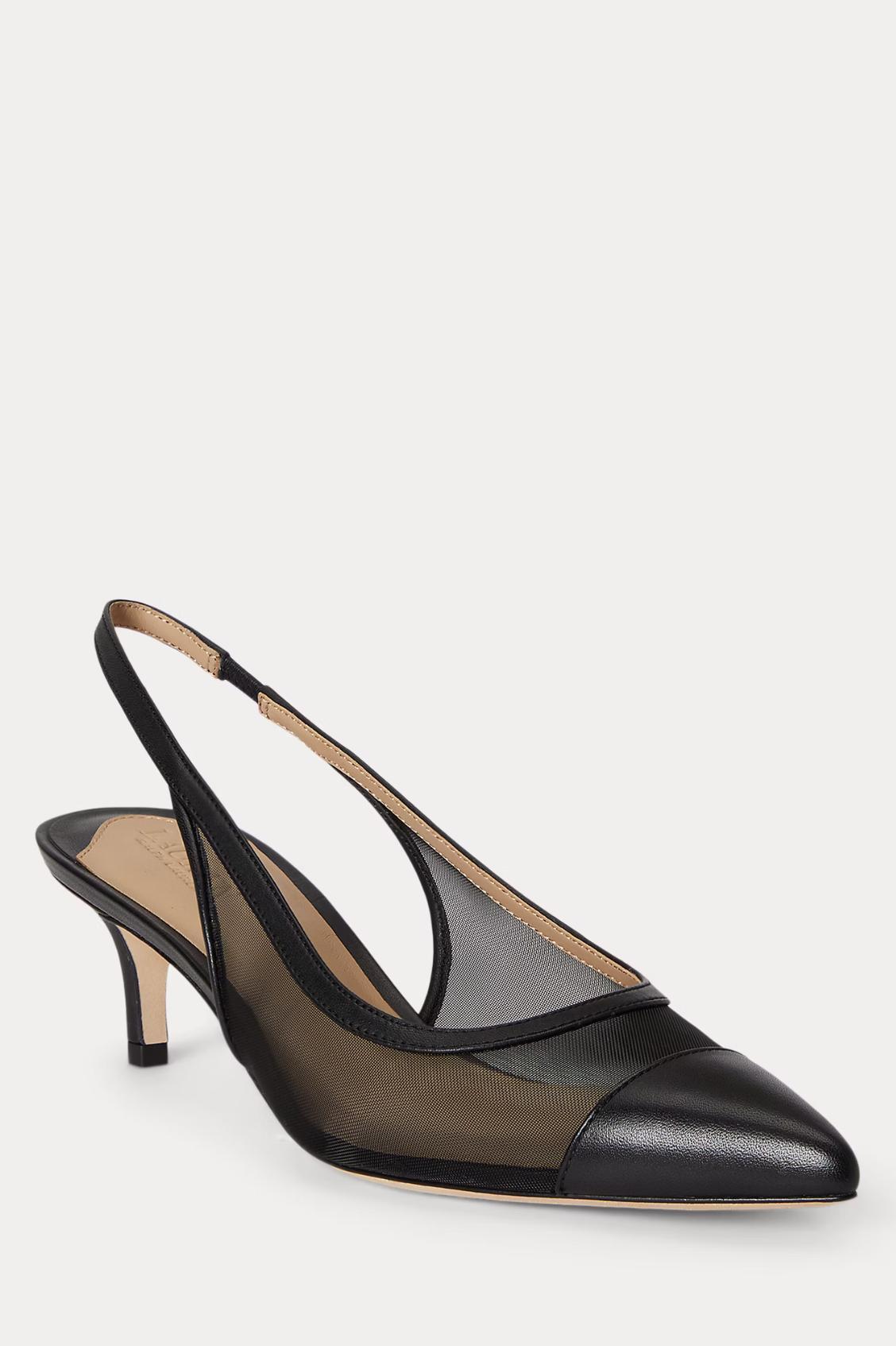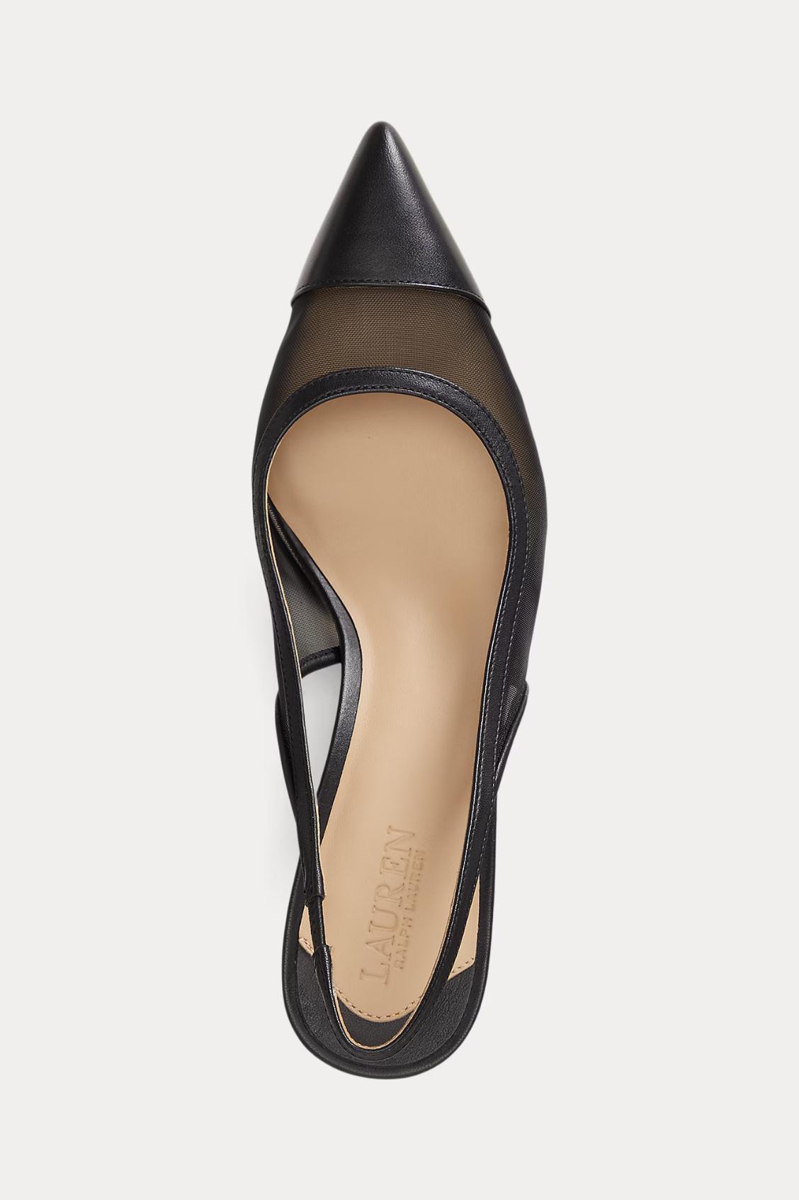 Questa versione della slingback Lolah II a punta è realizzata in rete semitrasparente tono su tono con una punta rinforzata in sontuoso cuoio nappa.
