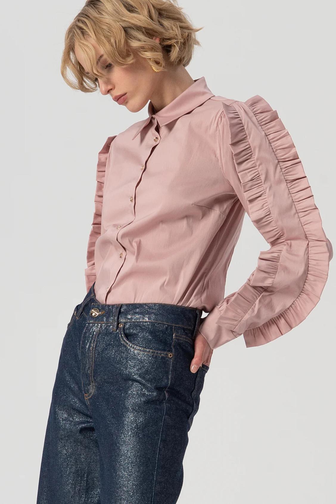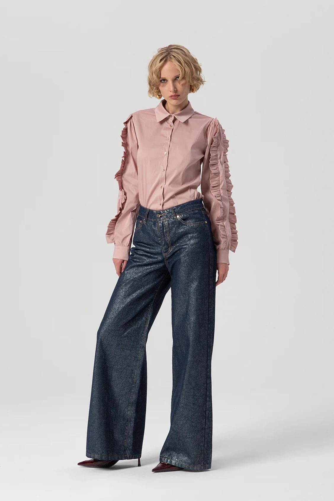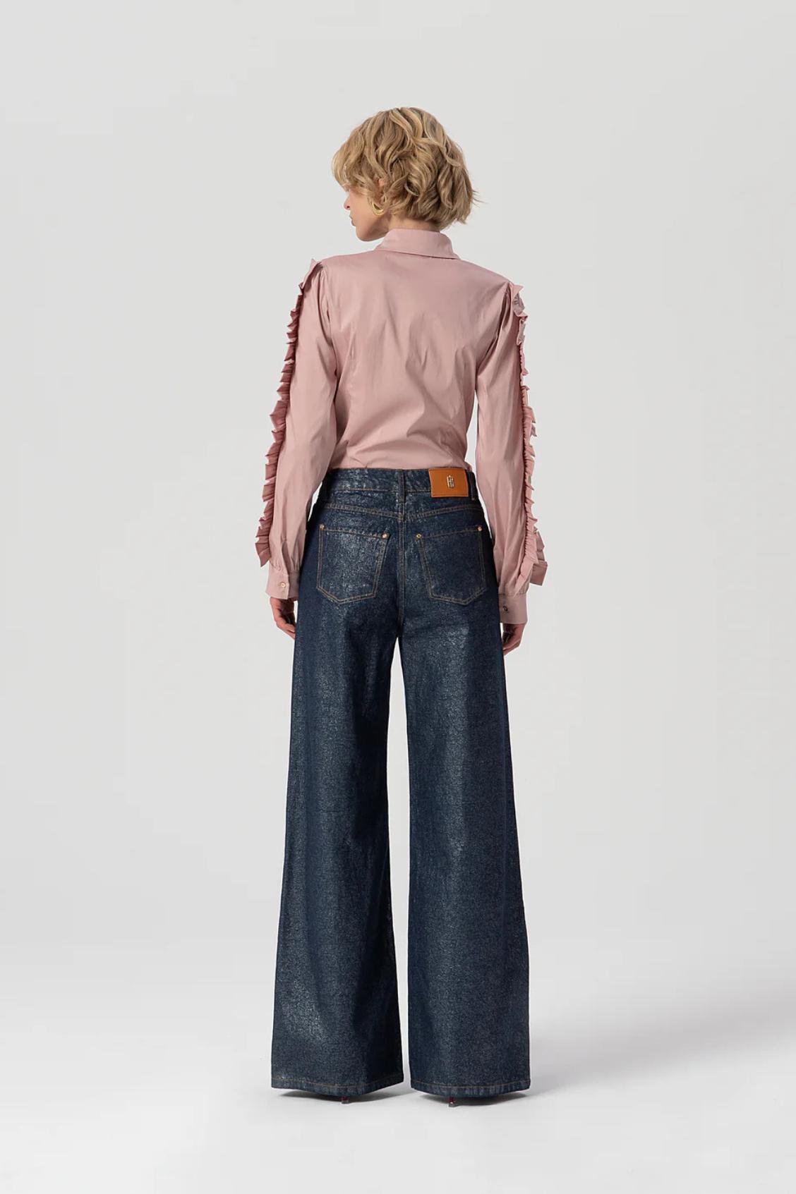 Jeans flare a palazzo in denim con spalmatura, vita alta, 5 tasche, e con fondo ampio.