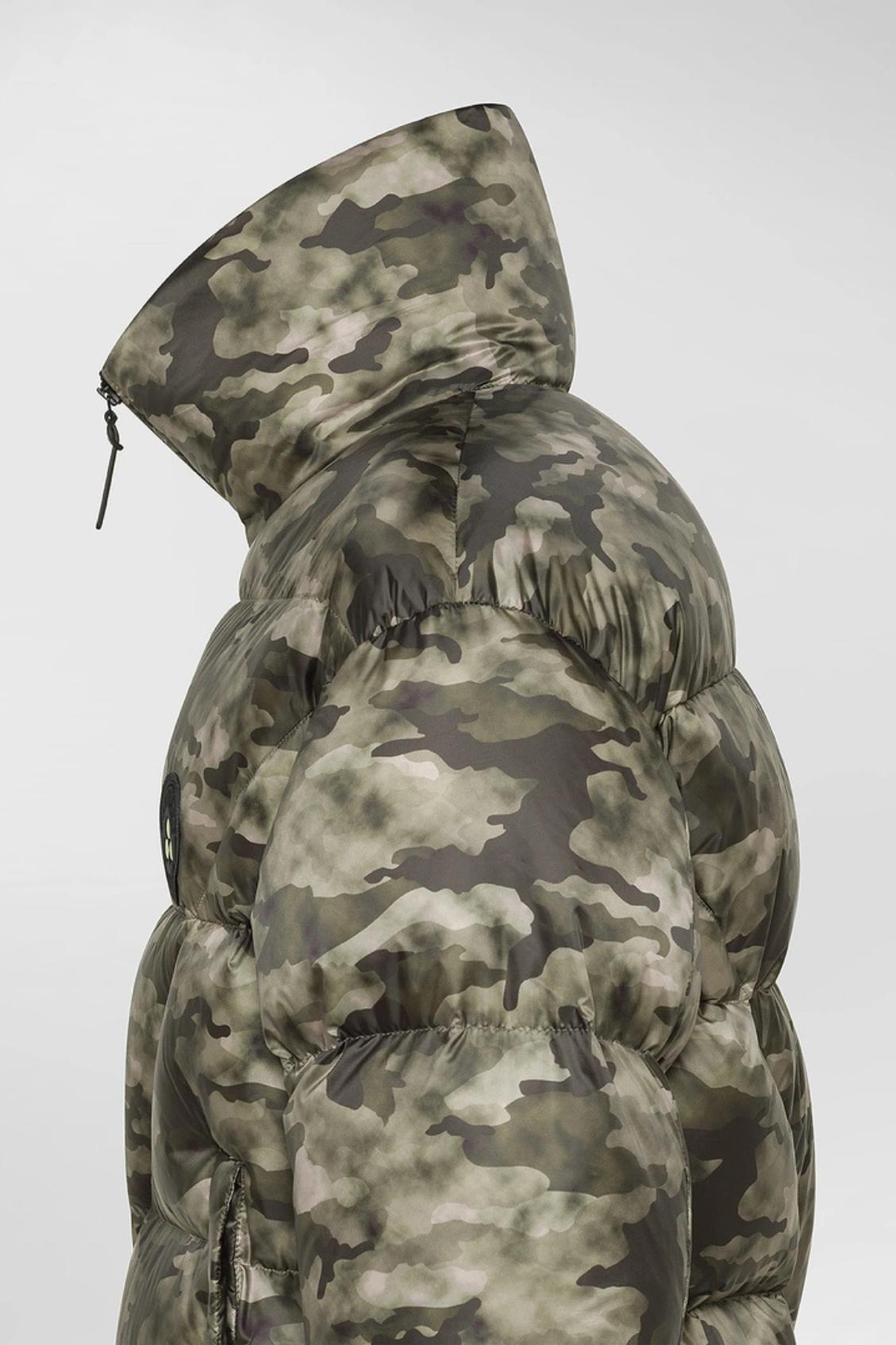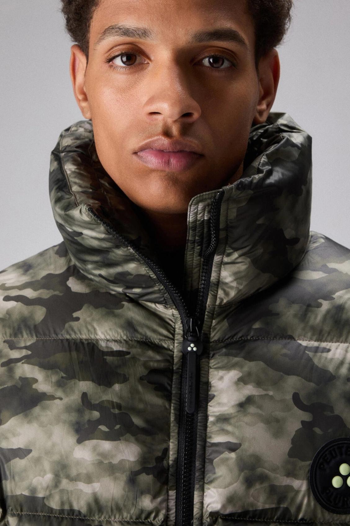 Un capo statement dalla forte personalità, parte della capsule Peuterey Plurals AI25 in collaborazione con Tony Effe. Realizzata in 100% poliestere riciclato post-consumo, questa puffer jacket dal collo alto presenta una texture semiopaca, una mano fluida e morbida, e una struttura super compatta. L’imbottitura in piuma naturale certificata assicura calore leggero, mentre il trattamento idrorepellente PFC Free, protegge da imprevisti meteo senza l’impiego di sostanze chimiche dannose per l’ambiente. Le maxi trapunte, la zip centrale nera a doppio cursore, le tasche laterali a filetto e il patch con logo tondo sul petto definiscono un design essenziale ma distintivo. L’iconica fantasia camouflage dona a questo capo un look bold, per chi vive la città con carattere e non ha bisogno di uniformarsi. Per la stagione AI25, Peuterey Plurals e Tony Effe – icona della trap e della moda italiana - riscrivono le regole del guardaroba urbano con attitudine e consapevolezza.
