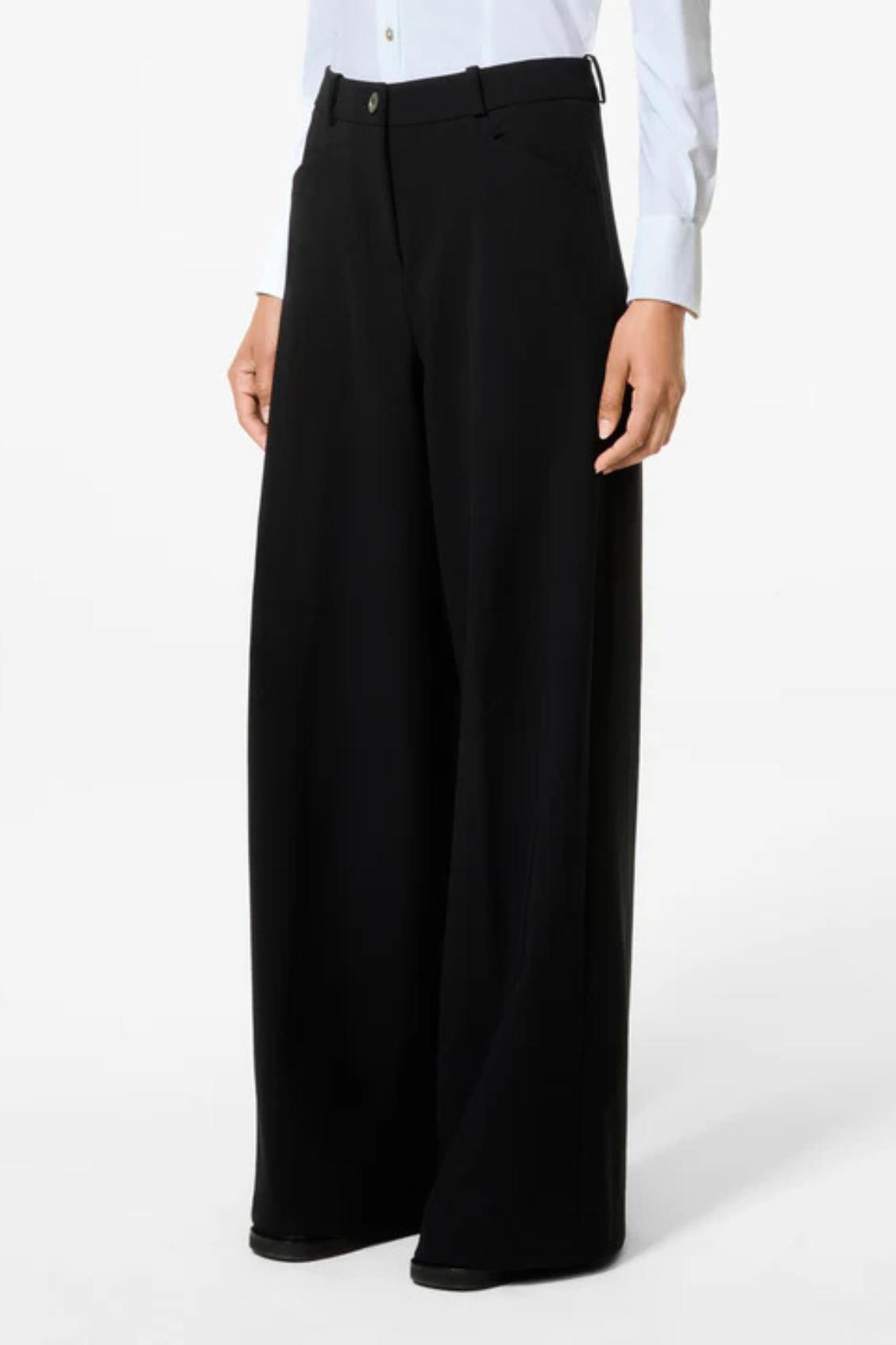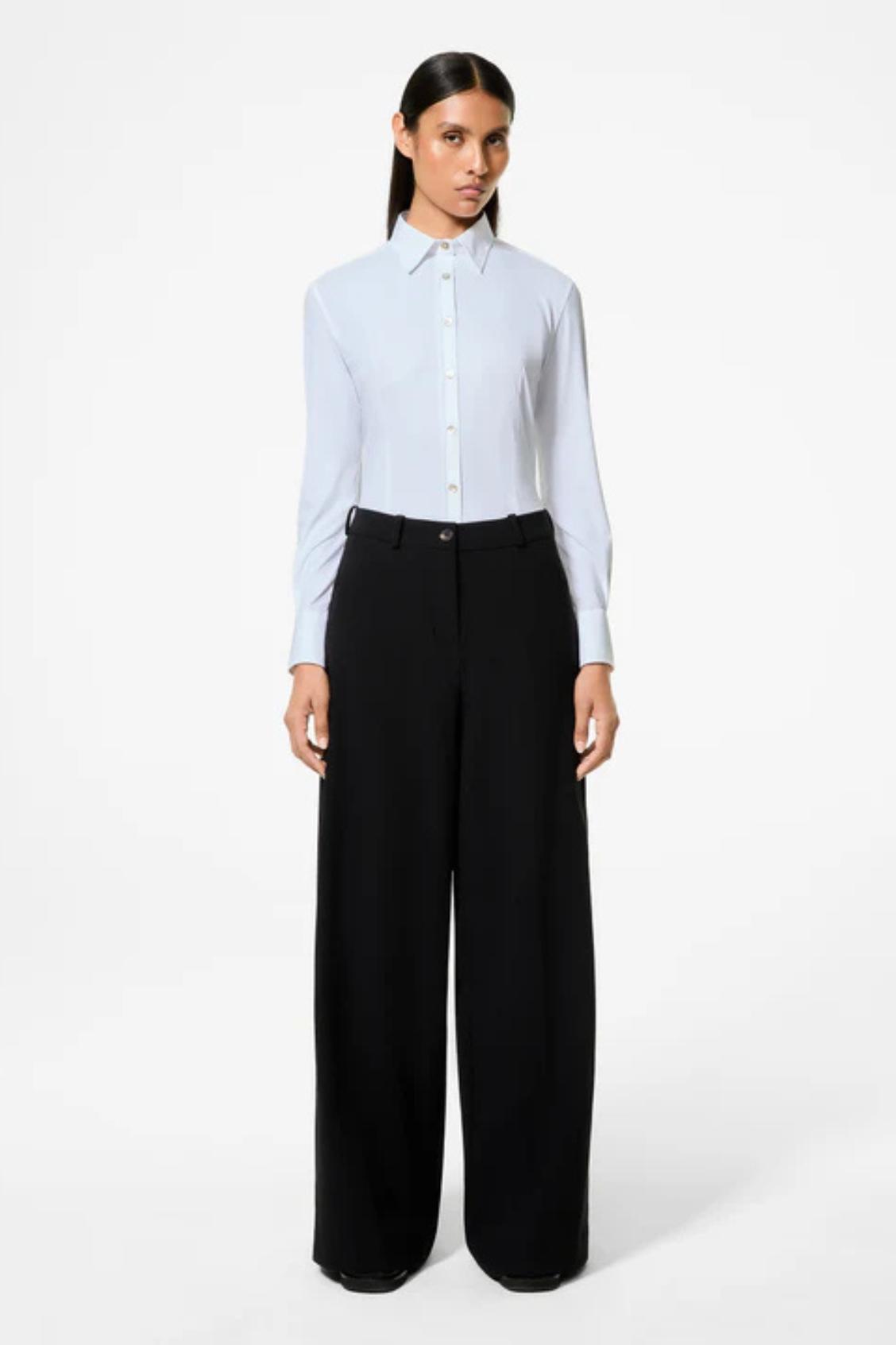 Espressione di un'eleganza moderna e consapevole, questi pantaloni si distinguono per la silhouette a palazzo che valorizza con naturalezza la linea femminile. Realizzati nell'esclusivo tessuto Surflex® stretch invernale, combinano un'elegante finitura opaca con la mano sorprendentemente morbida. Le proprietà antipiega ed easy care ne fanno un capo dal carattere pratico e distintivo, pensato per accompagnare con stile il ritmo dinamico della quotidianità. Le tasche alla carrettera e la chiusura con bottone in vero corno aggiungono una nota di sofisticata essenzialità. Ideali in abbinamento al blazer monopetto coordinato per un look urban chic, rappresentano la scelta perfetta per chi ricerca un equilibrio armonioso tra funzionalità, comfort e raffinatezza.