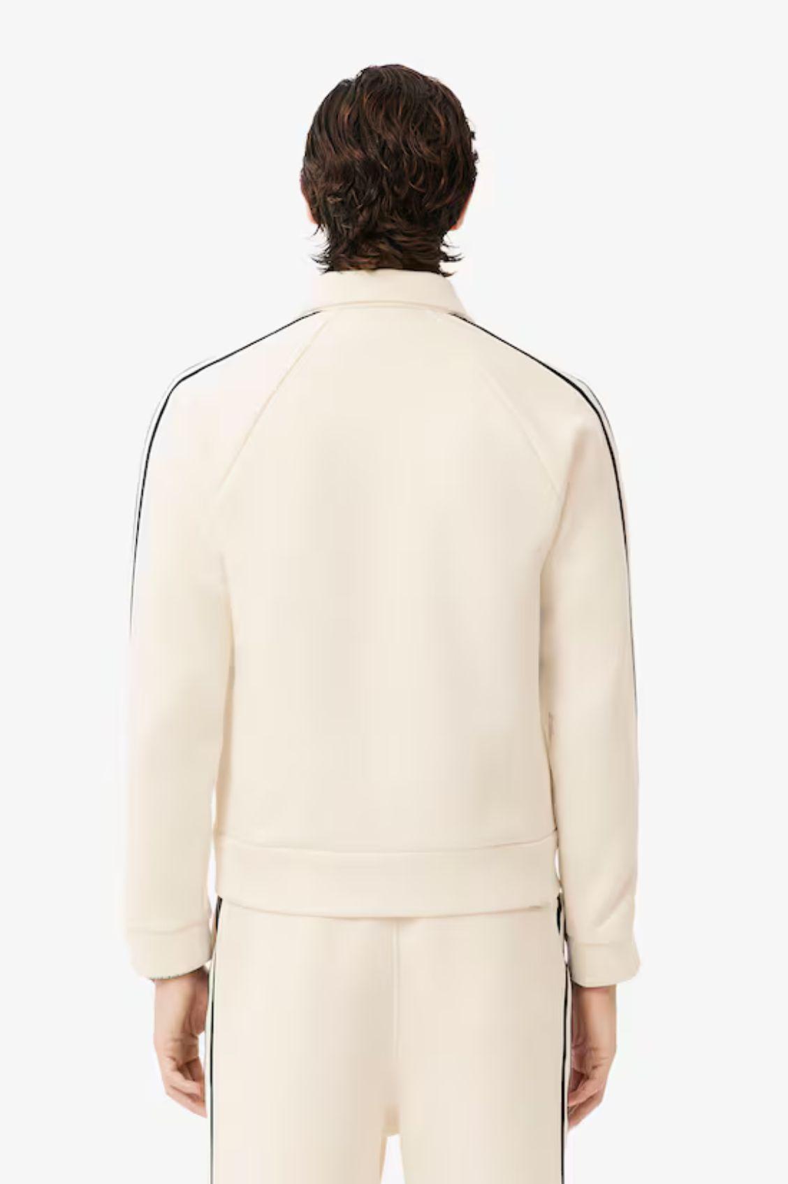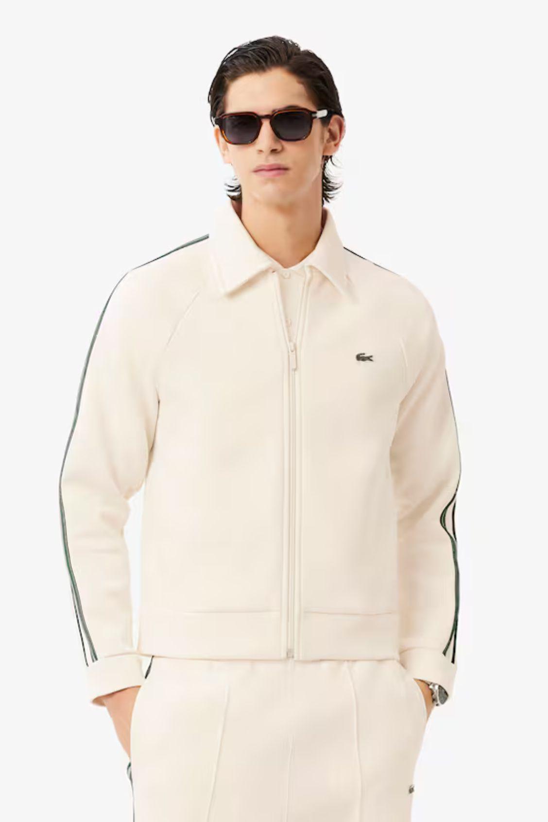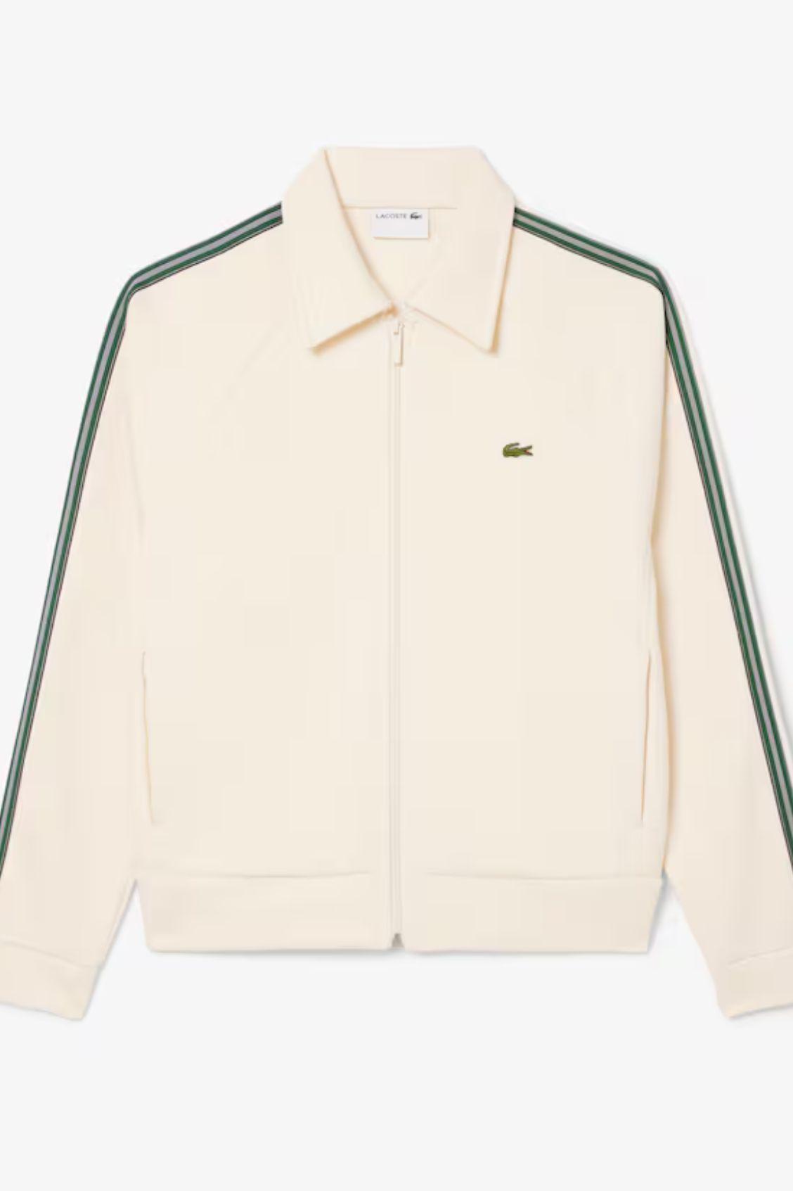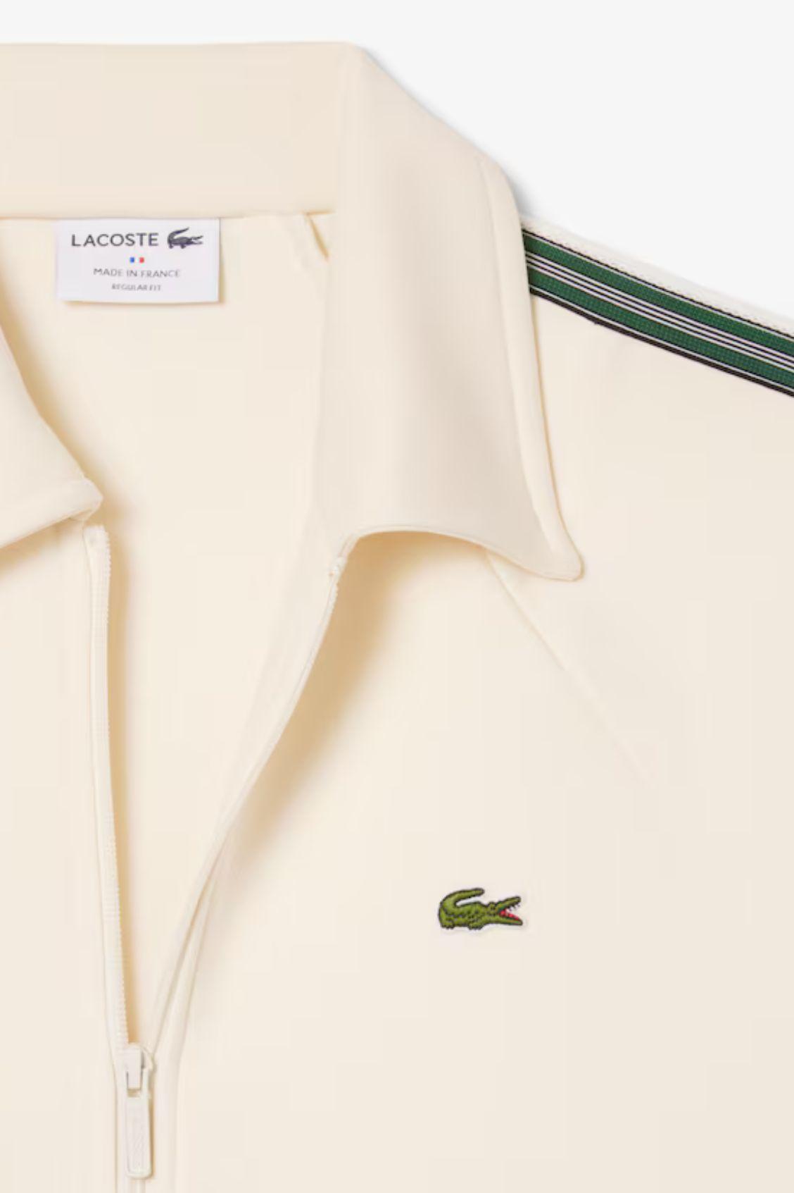 Elegante felpa con zip dal design all'avanguardia, firmata Lacoste, creatori di sportswear dal 1933. Realizzata in Francia in confortevole jersey double face, con sofisticati dettagli di finitura tra cui pannelli a righe a contrasto testurizzati. Il connubio perfetto tra moda e sportswear, rifinito con l'iconico coccodrillo ricamato.