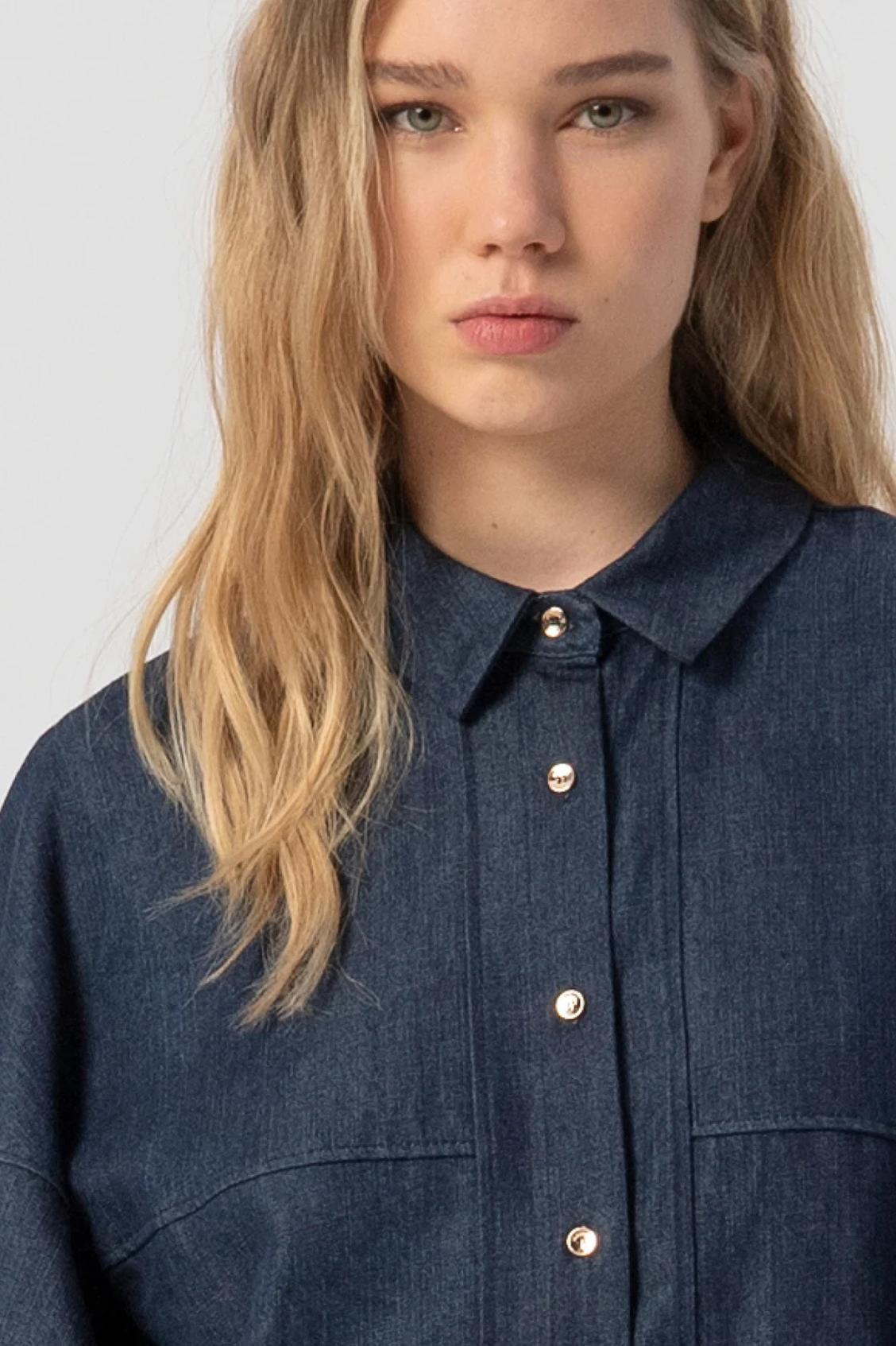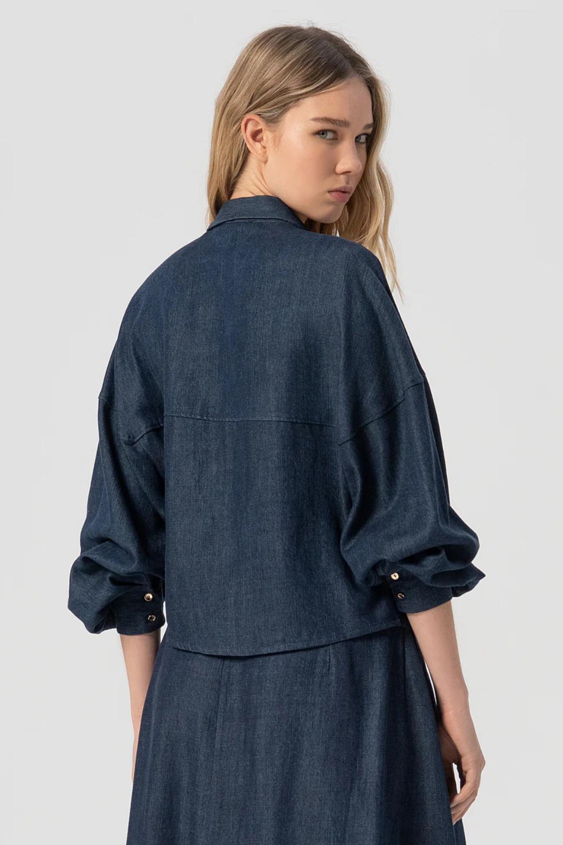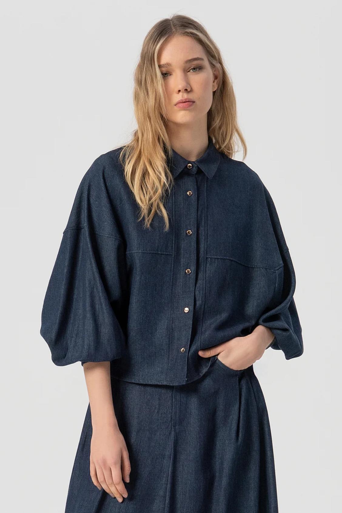 Camicia over in chambray con lavaggio raw, colletto classico, bottoni centrali per apertura, e con maniche a 3/4 a palloncino.