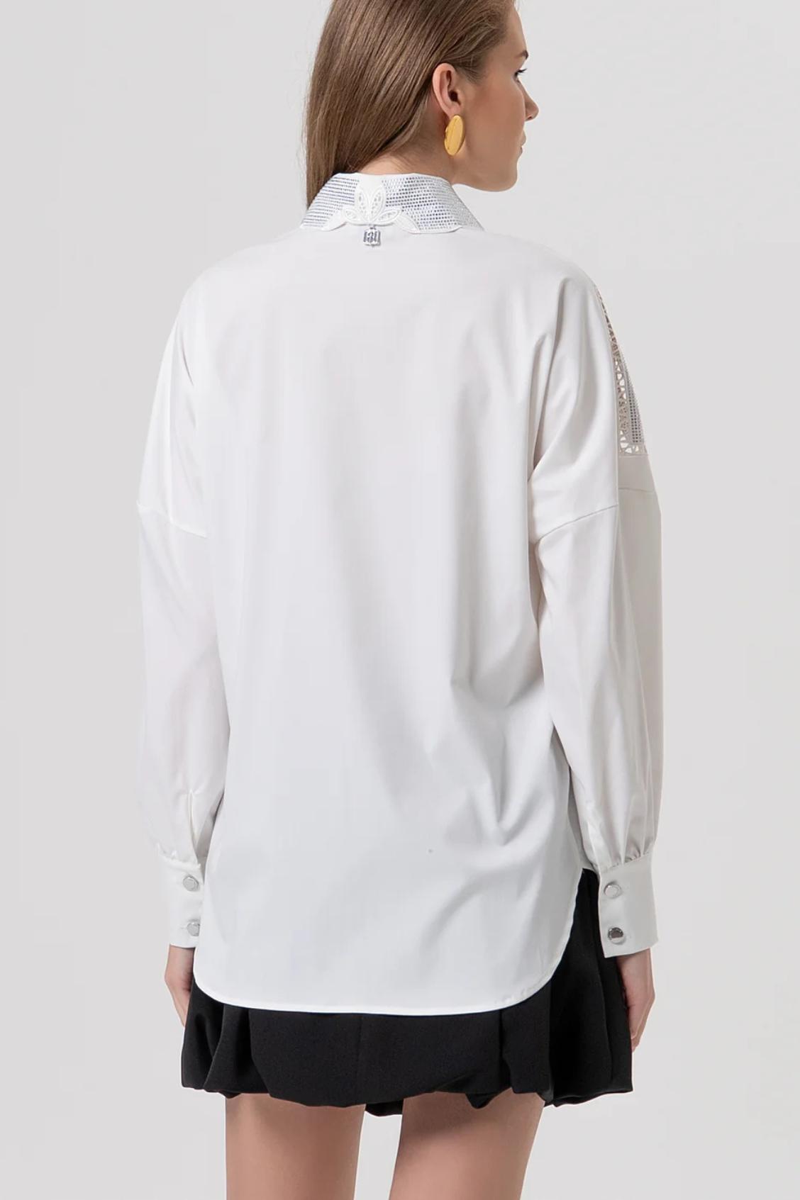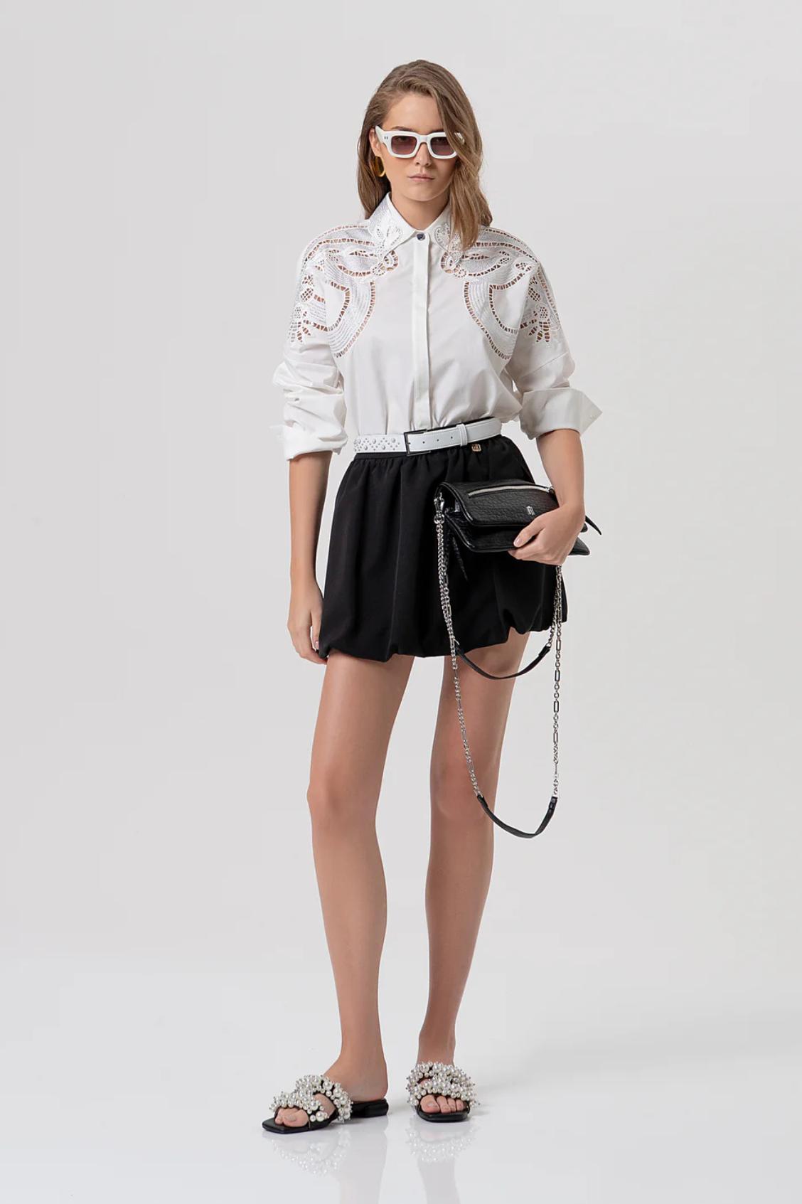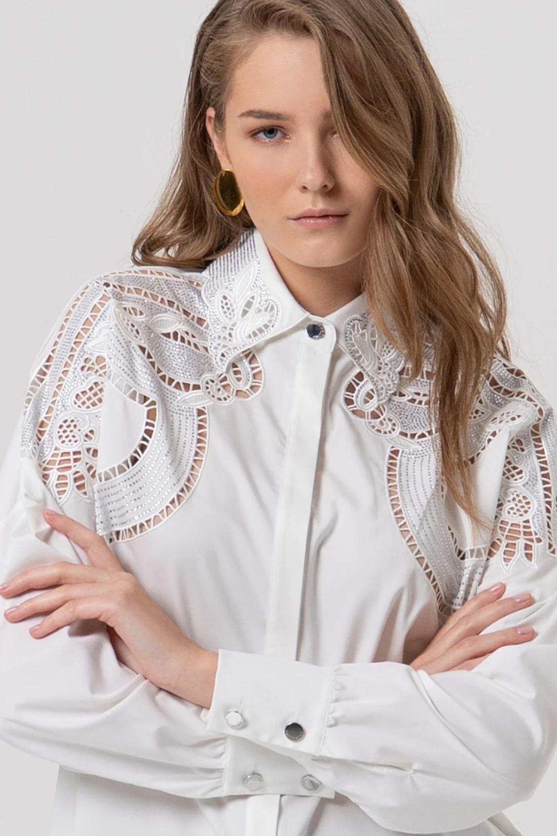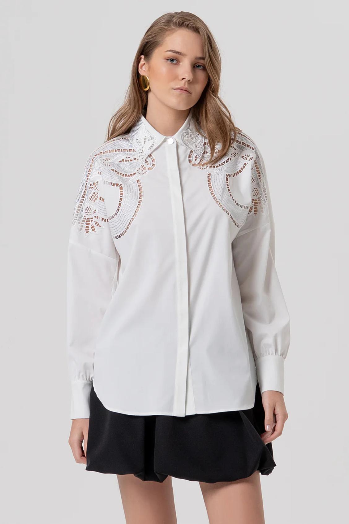 Camicia regular con ricami applicati, colletto classico, bottoni centrali per apertura, e con maniche lunghe voluminose.