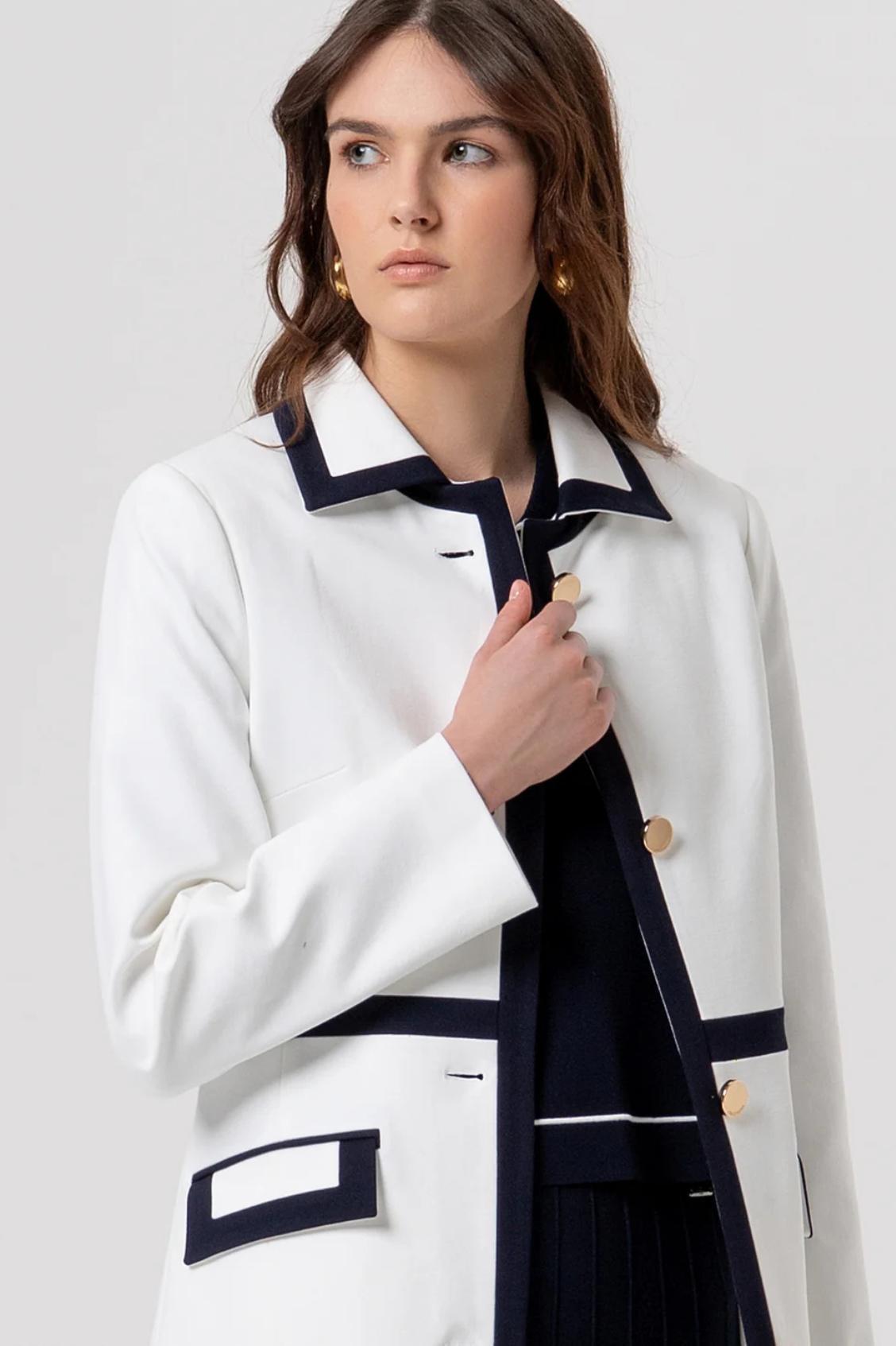 Giacca slim modello spolverino con apertura centrale con bottoni, colletto classico, pattine laterali, e con maniche lunghe.