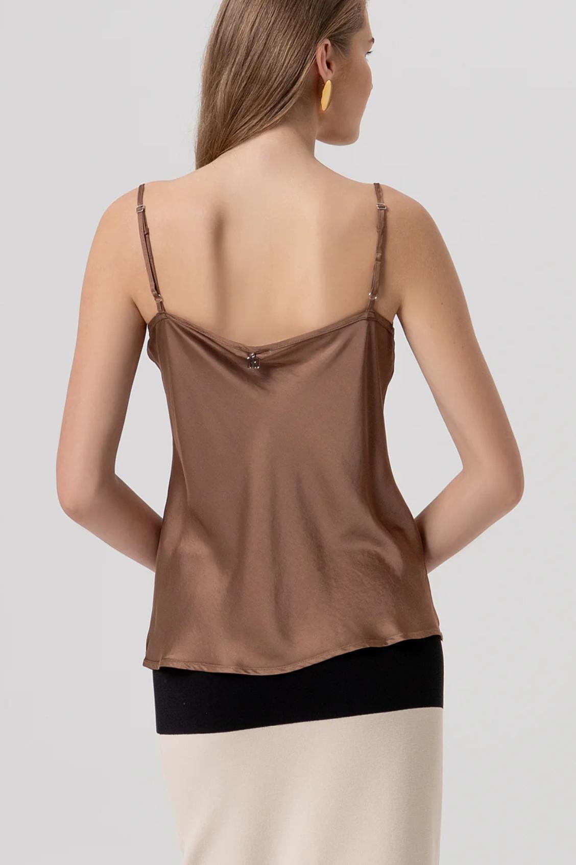 Top senza maniche in raso di viscosa, scollo a V, e con bretelline sottili.