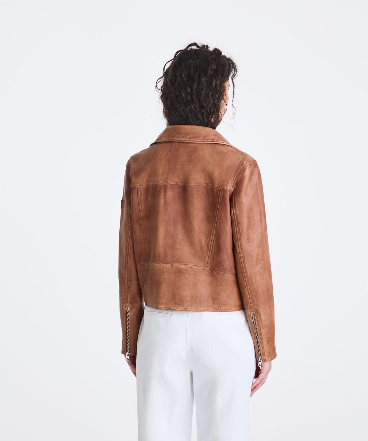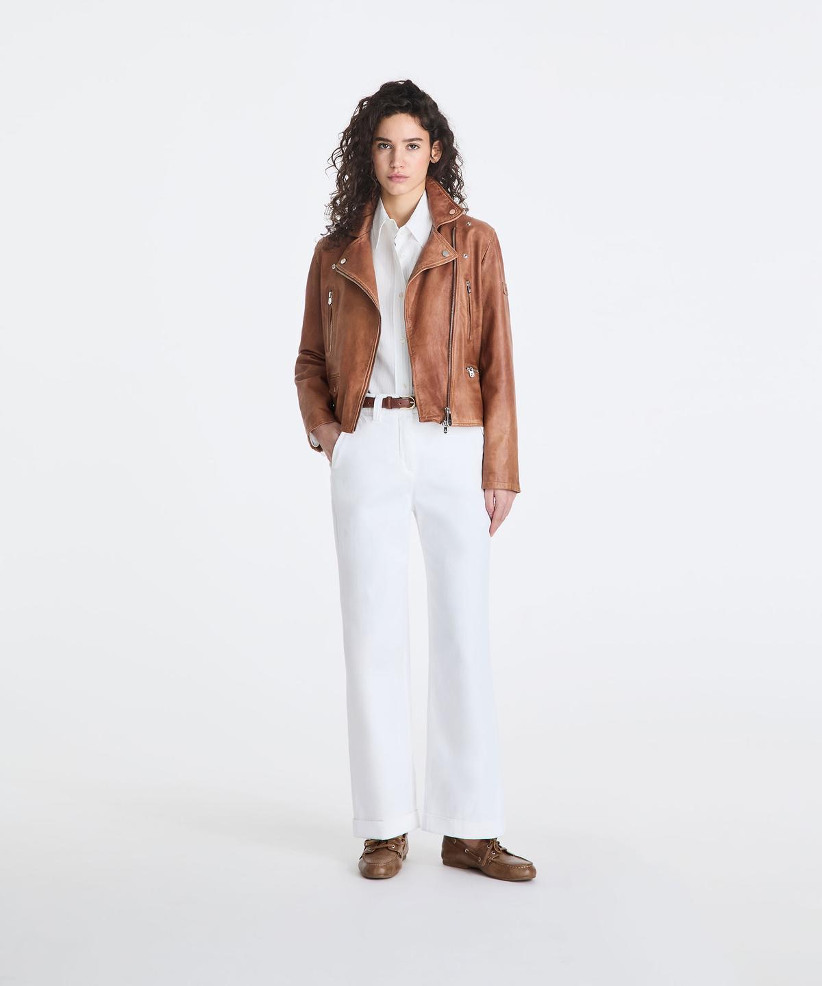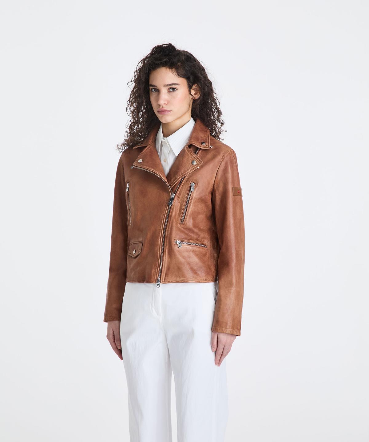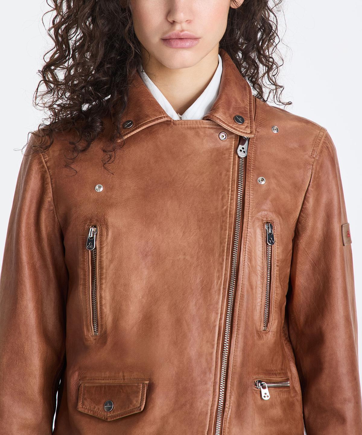 Un vero must-have del guardaroba femminile: il chiodo in morbida pelle. Dal taglio corto e dalla silhouette slim, è impreziosito da dettagli ricercati come i due taschini con zip sul petto, una tasca laterale con zip e un’altra con patta. La zip centrale asimmetrica, il colletto con revers e le zip sui polsi aggiungono carattere e dinamismo al modello. Un’icona di stile reinterpretata con il tocco sofisticato di Peuterey.