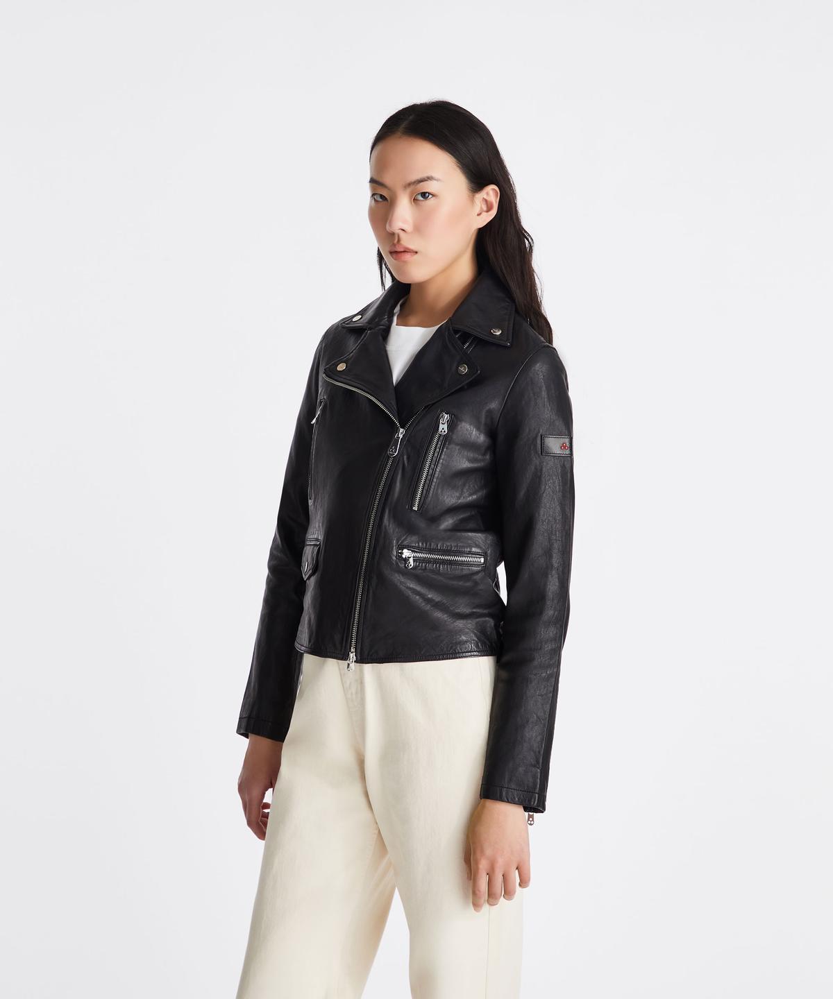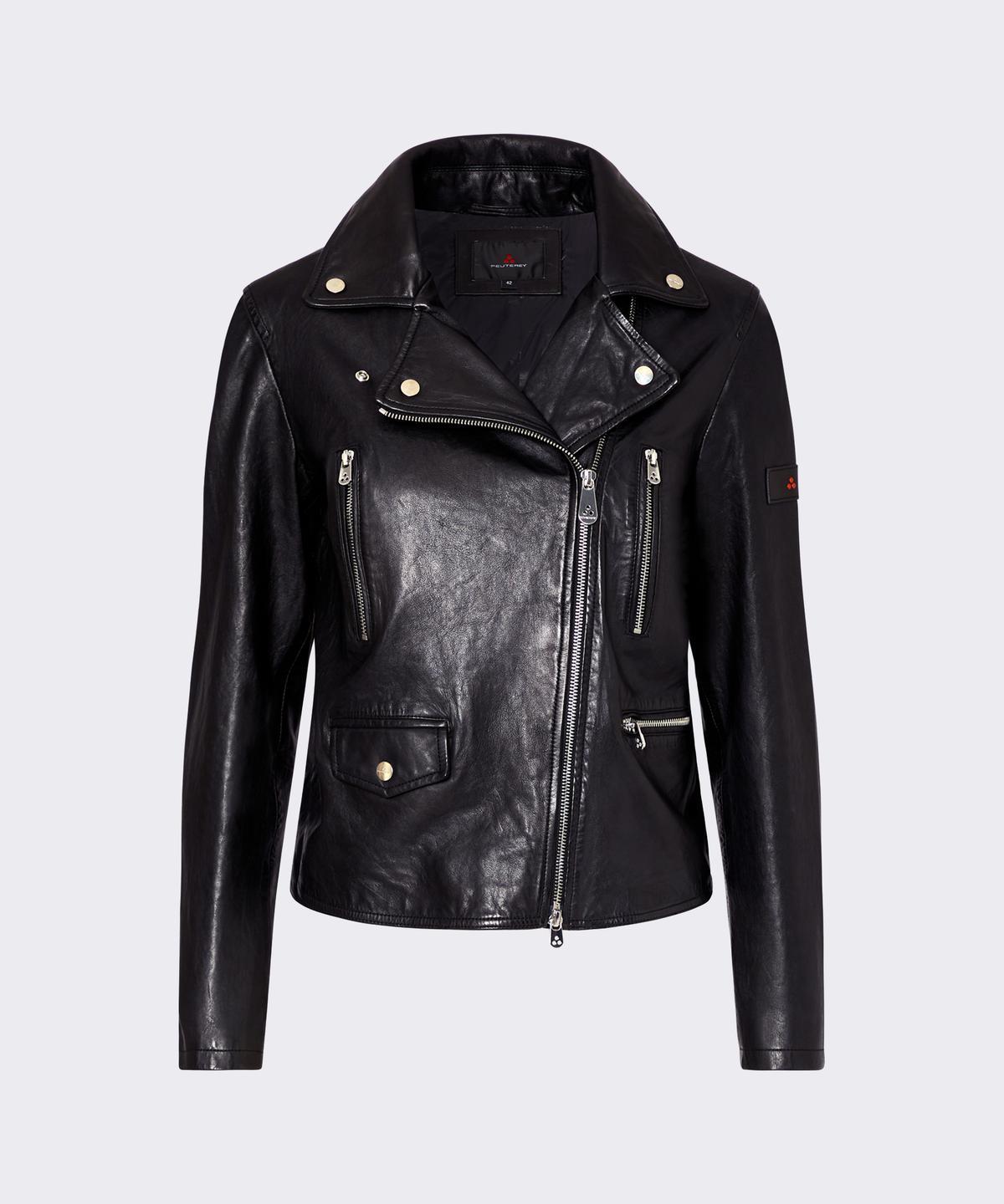 Un vero must-have del guardaroba femminile: il chiodo in morbida pelle. Dal taglio corto e dalla silhouette slim, è impreziosito da dettagli ricercati come i due taschini con zip sul petto, una tasca laterale con zip e un’altra con patta. La zip centrale asimmetrica, il colletto con revers e le zip sui polsi aggiungono carattere e dinamismo al modello. Un’icona di stile reinterpretata con il tocco sofisticato di Peuterey.